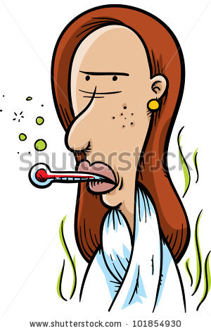 Sick thermometer cartoon: A sick, cartoon woman with a