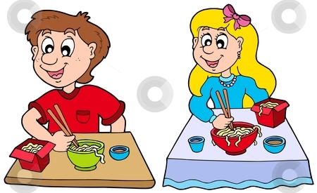 Kids eating lunch clipart: Boy and girl eating Chinese