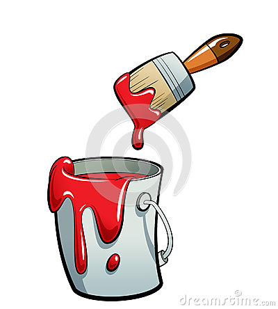 Paint bucket and brush: Cartoon red color paint in a