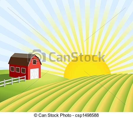 Field clipart: Farm and fields at sunrise