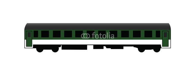 Passenger train side view: Green passenger rail car