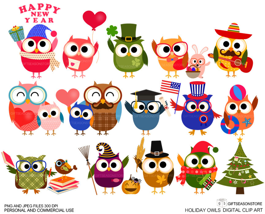 Holiday clipart: Holiday owls Digital clip art
