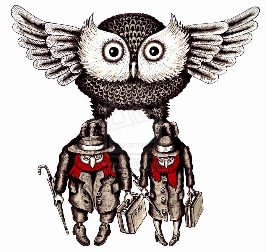 Two people in love drawings: Owl with two people surreal