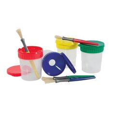 Paint brushes with paint on them: Paint Cups And Brushes