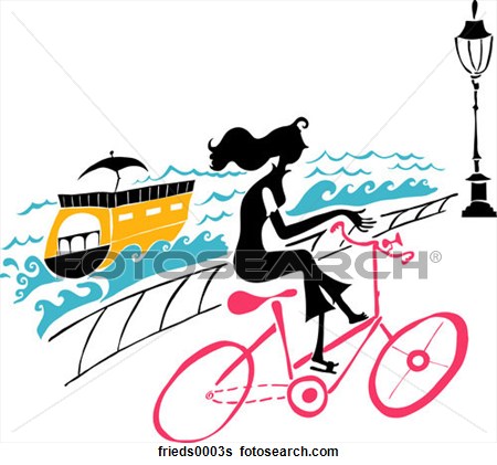 Riverbank clipart: People, woman, bicycle, body of water, river, riverbank, boat