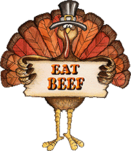 Turkey clipart: Pilgrim turkey says eat beef.