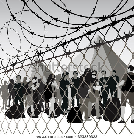 Refugee clipart: Refugees behind chain link