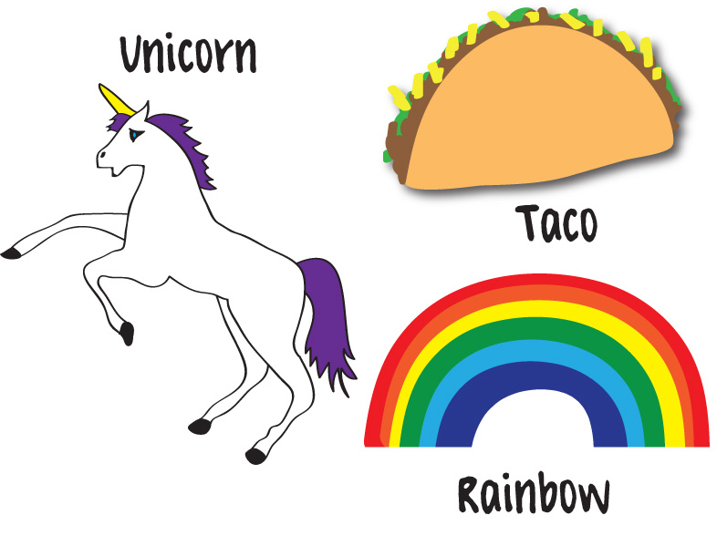 Rainbow unicorn cartoon: taco and a good rainbow).
